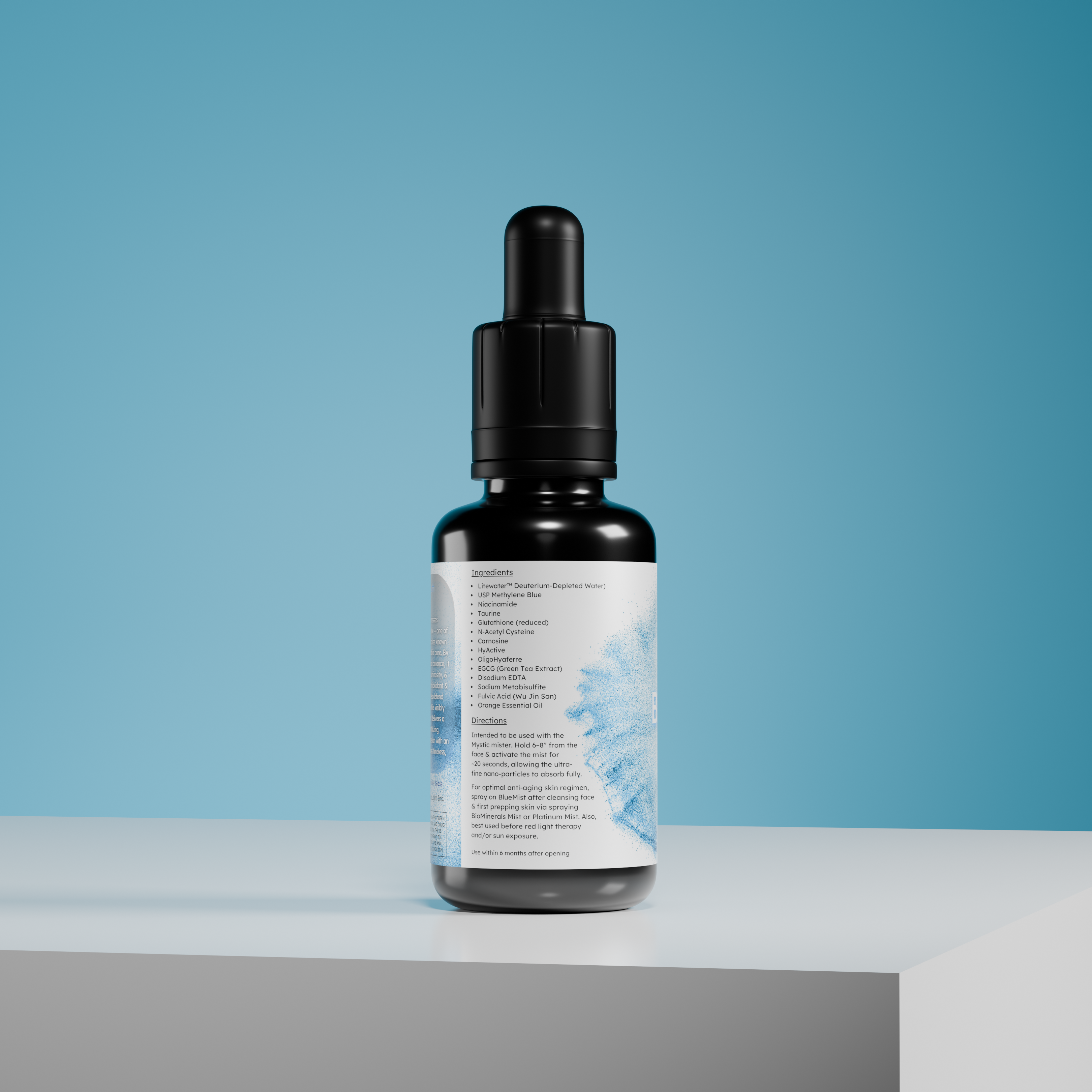 Blue Mist: methylene blue in one of the best anti-aging compounds for skin by supporting mitochondrial respiration, boosting ATP generation, and enhanceing cellular repair. This leads to visibly improved vitality, tone & youthful bounce.