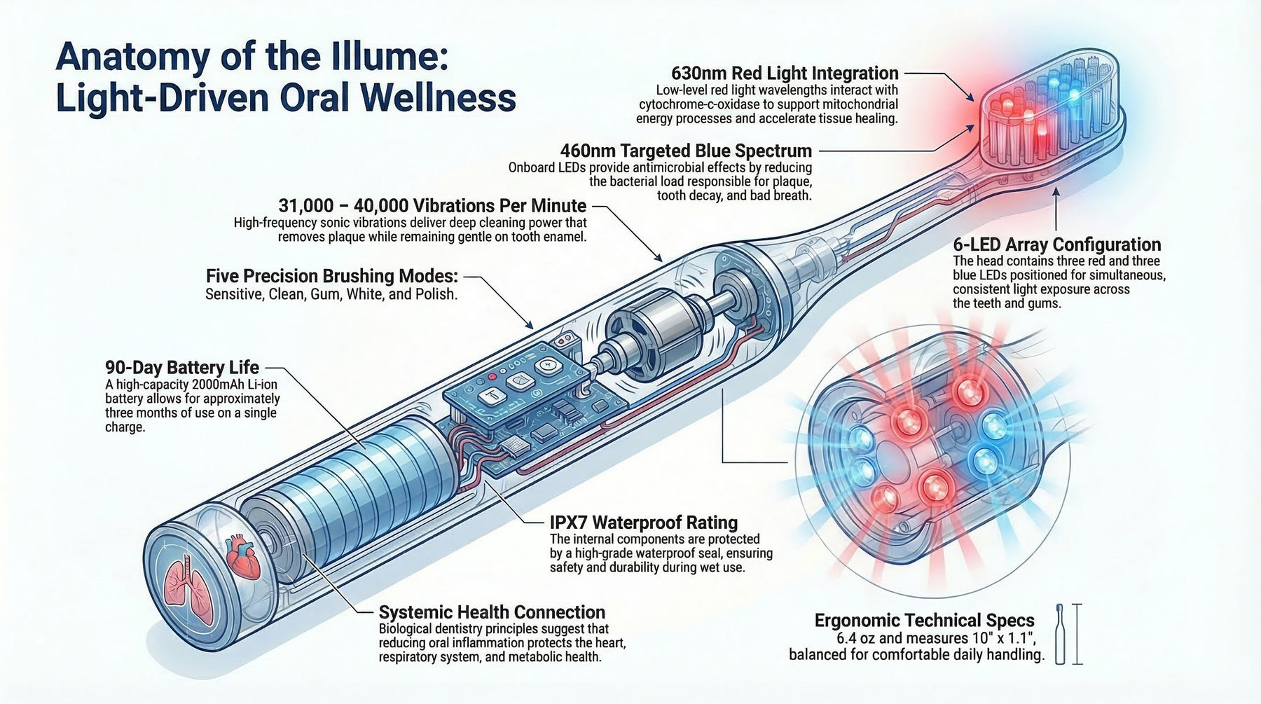 Keeps the light-delivery system exactly where it matters most: at the brush head.