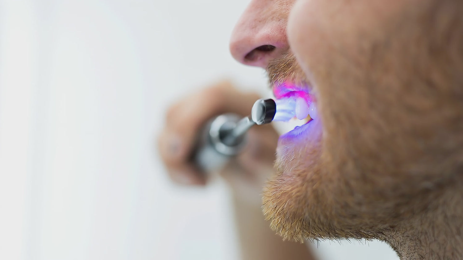 Guide the brush slowly across the front, back, and chewing surfaces of each quadrant so the sonic cleaning and light exposure can work across the full mouth. Two minutes aligns with standard brushing guidance.